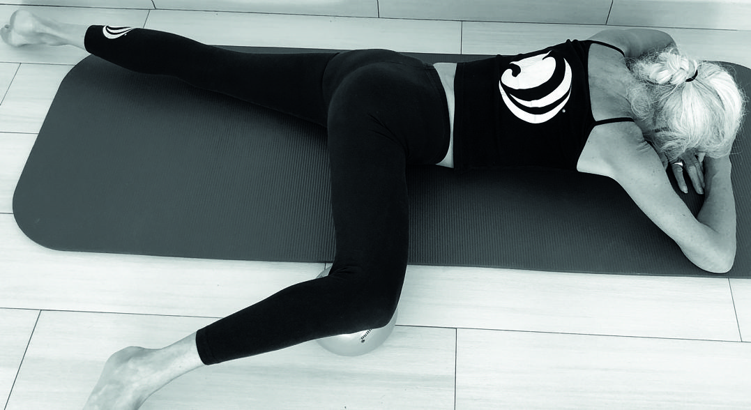 ●身体を少しずつ左側に動かして、太もも全体の約1/3の場所にボールを移動する。ボールに圧をかけながら大きく呼吸を3〜4回行う。