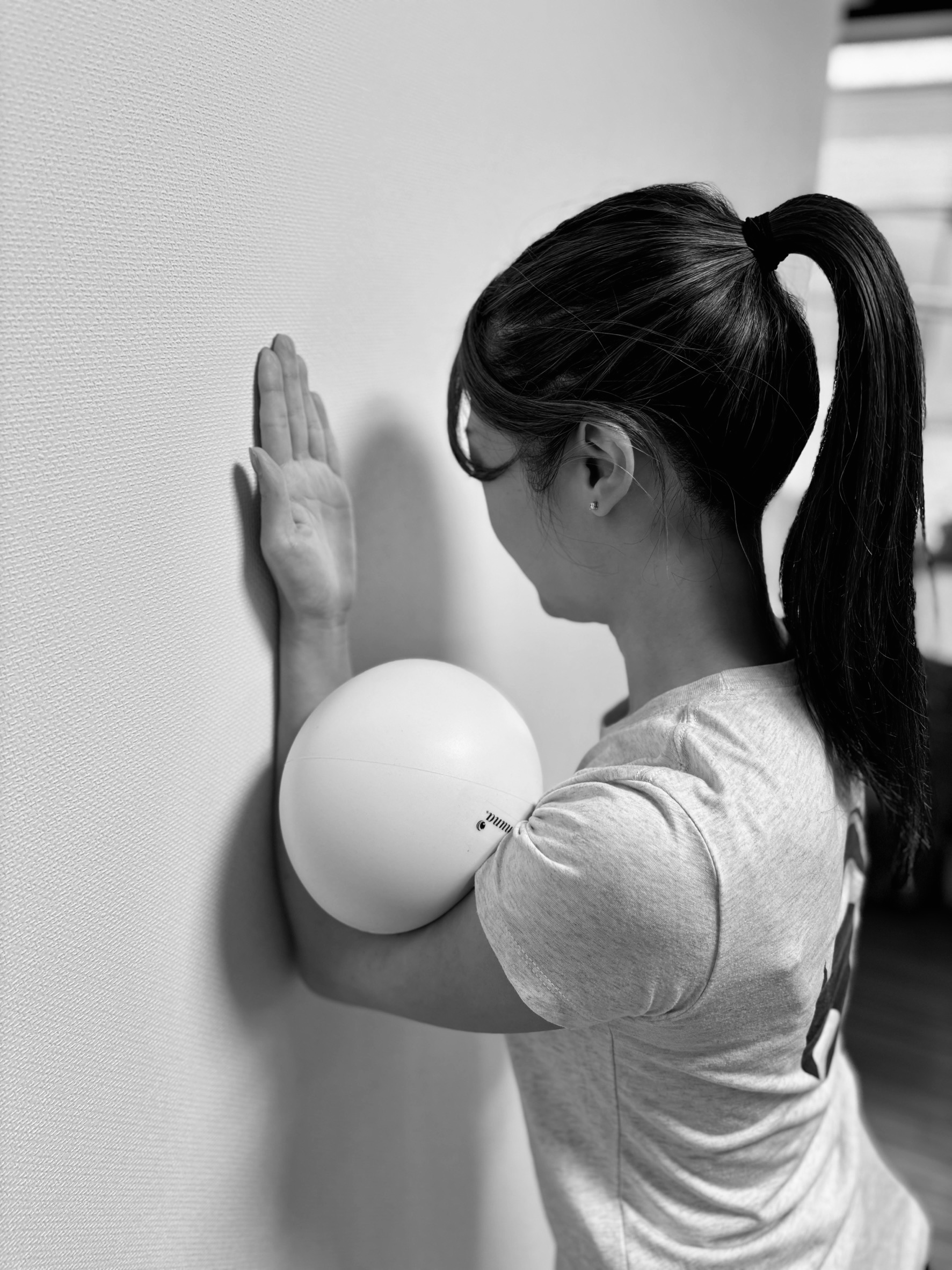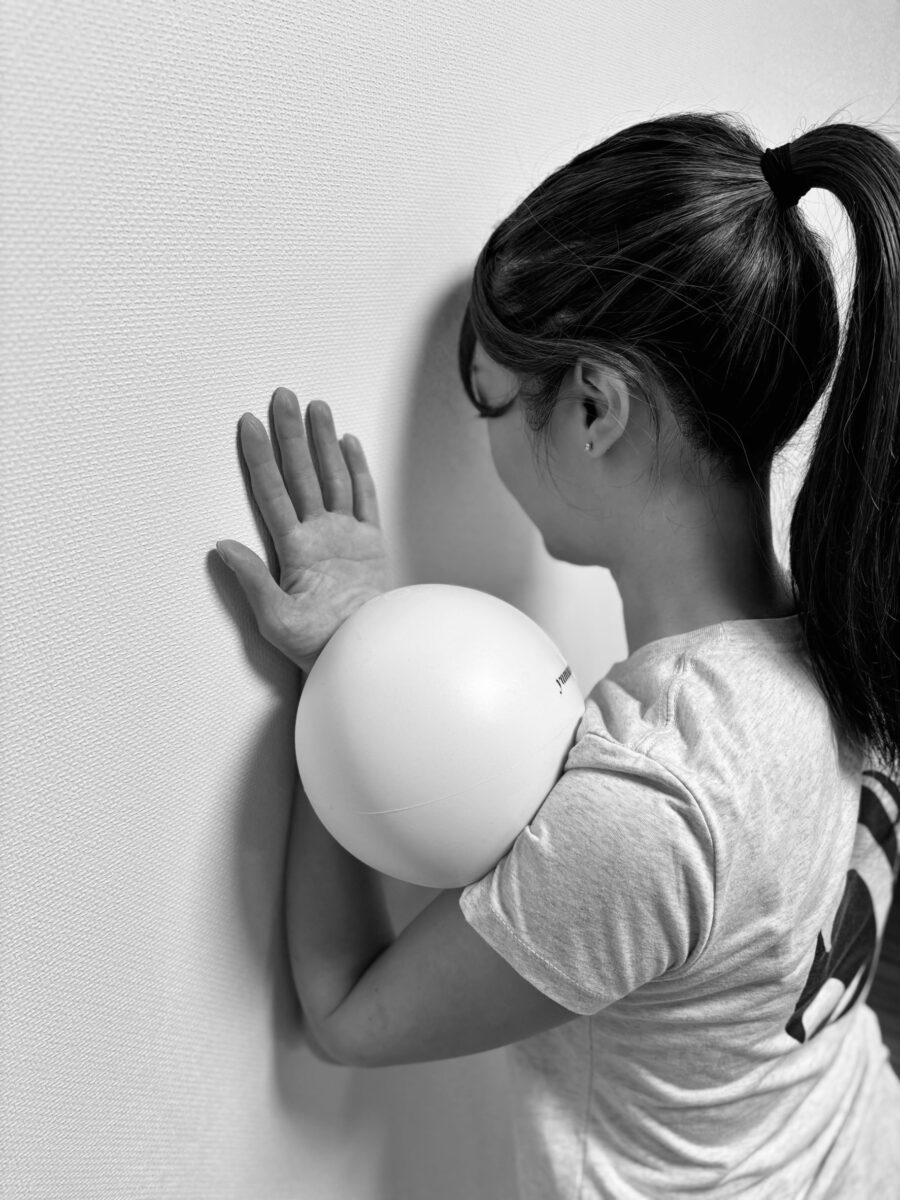 ●壁に向かって立ちます。手のひらを自分に向けて片方の腕を上げ、パールボールを肘の内側にできるだけ入れ込んで挟みます。