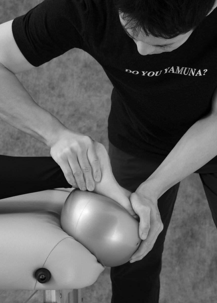 そして、その後に構築されたのが「テーブルトリートメント」です。クライアントはベッドの上に横になり、有資格者がヤムナボールを使いながら全身をトリートメントしていきます。施術者による「牽引」によって筋肉や骨が最適な位置へ導かれ、関節には空間と動きが生まれます。通常のマッサージとは異なり、ボールによる柔らかな圧が身体の凹凸にフィットしながら深部に働きかけ、全身にストレッチ効果と深いリラックスをもたらします。