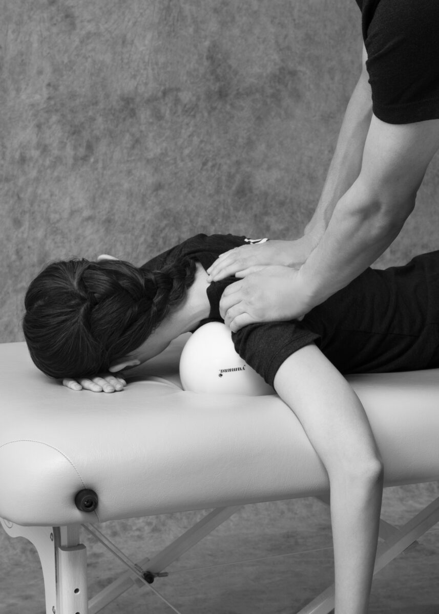 ⚫︎それぞれのポイントでは、ボールの接触面に適度な圧がかかります。施術者が手を添えることでターゲットとなる部位を的確に捉え、圧の強さを細かく調整します。