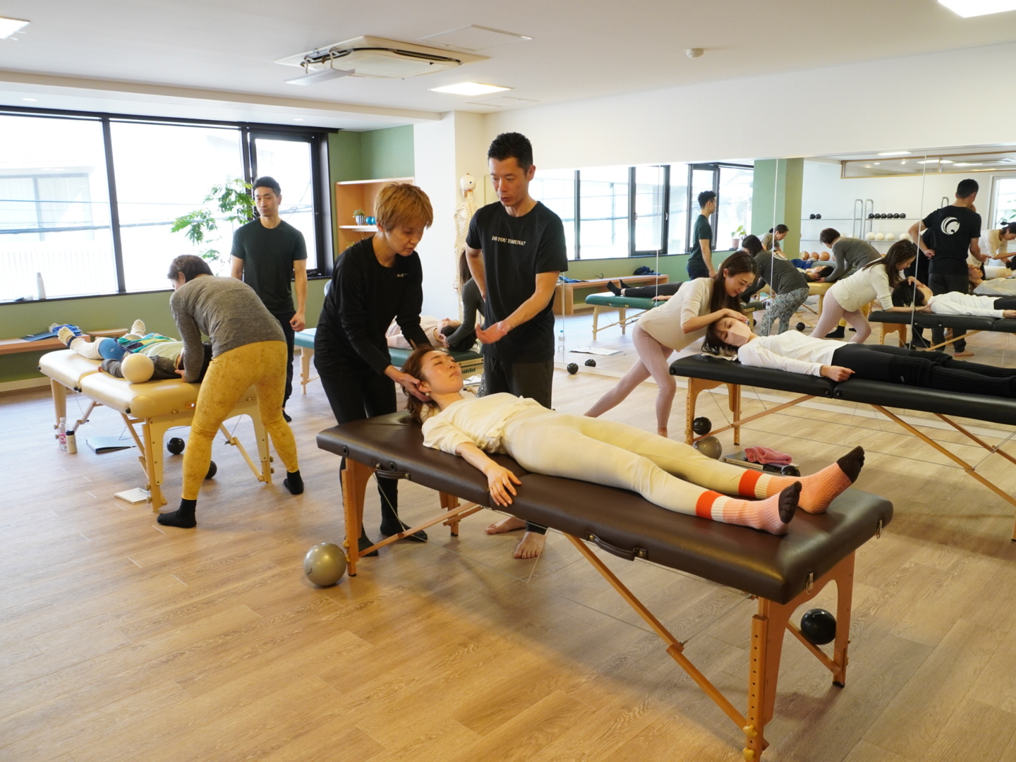 今回の「ヤムナテーブルトリートメント資格トレーニング」は、3月7日から11日までの5日間ヤムナスタジオで開催されました。1日6時間、合計30時間にわたるトレーニングです。参加者は12名。内訳はYBR(ヤムナボディローリング)のプラクティショナー資格保持者が10名、YFF(ヤムナフットフィットネス)のプラクティショナー資格保持者が1名、無資格者が1名でした。なお、資格を持っていない場合でも、事前に一定の条件でヤムナボディローリングを受講していれば参加は可能です。